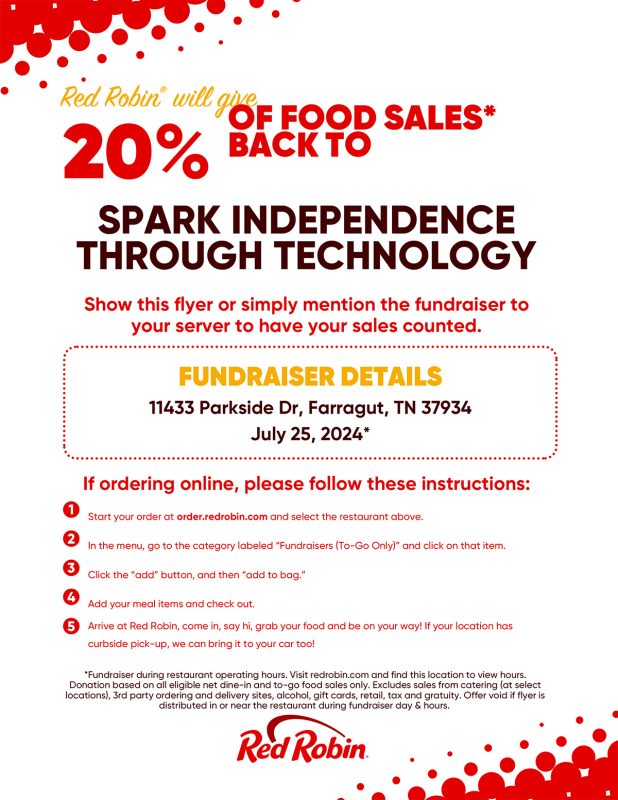 Our Red Robin fundraiser is coming up Thursday, July 25. Red Robin in Turkey Creek (11433 Parkside Drive) is donating 20 percent of all food sales all day to Spark! Enjoy a delicious meal and support Spark at the same time!